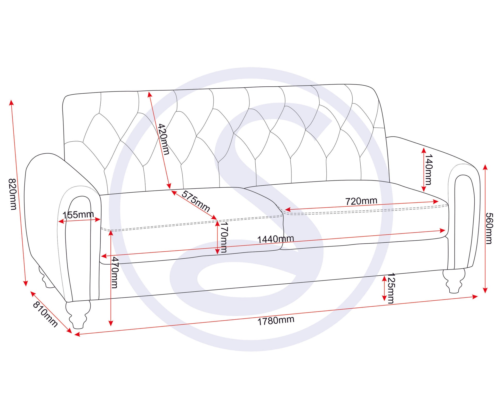 Overall Seating Area Width (3 Seater) 1440mm