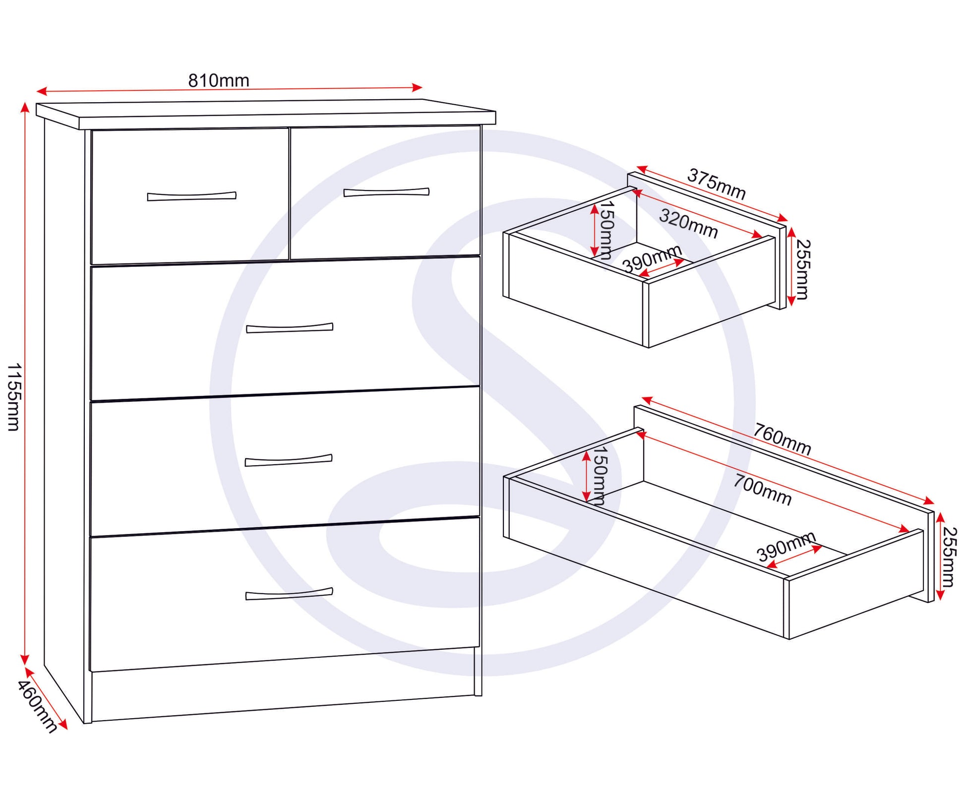 Nevada 3+2 Drawer Chest - Black Gloss