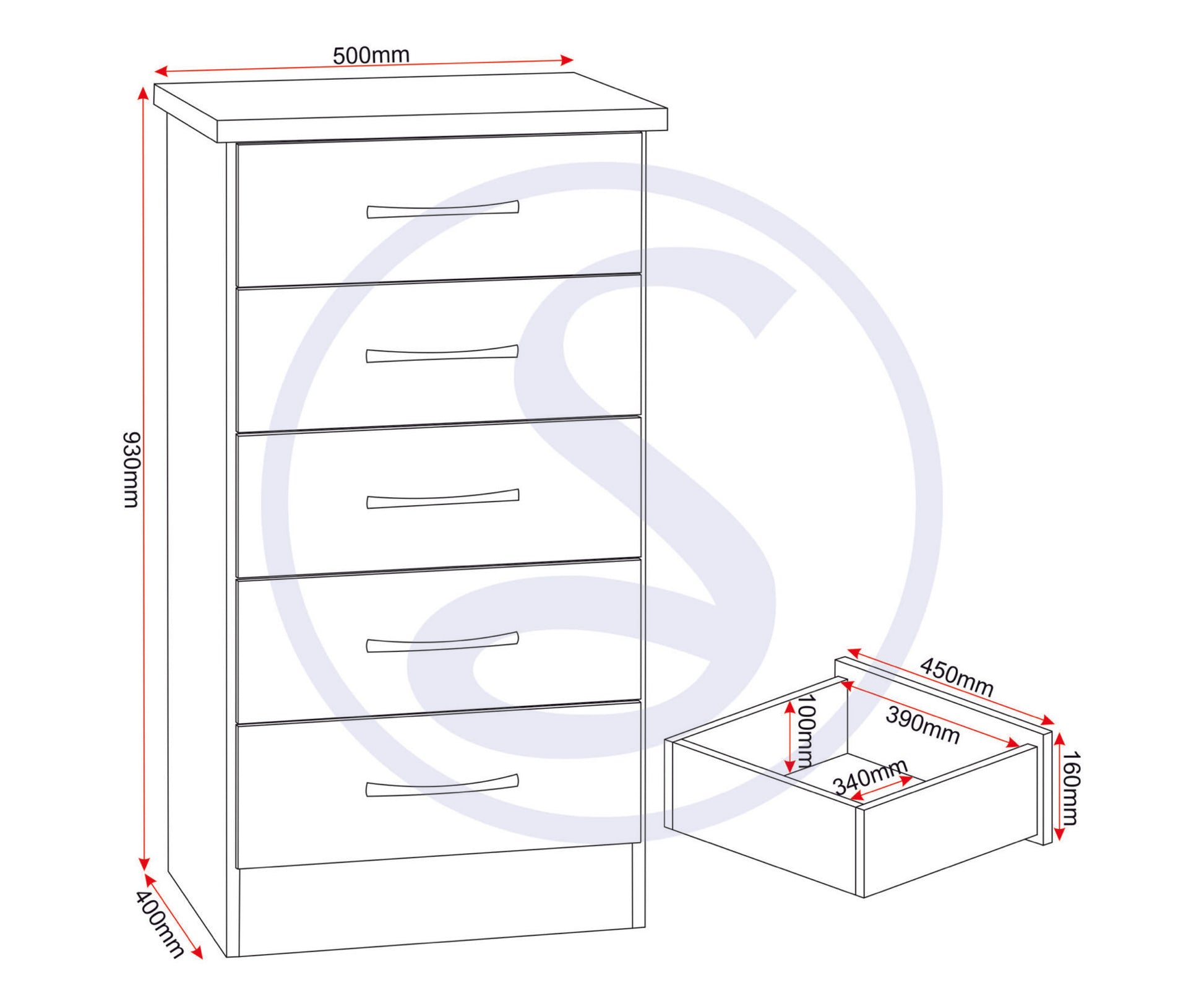 Nevada 5 Drawer Narrow Chest - White Gloss